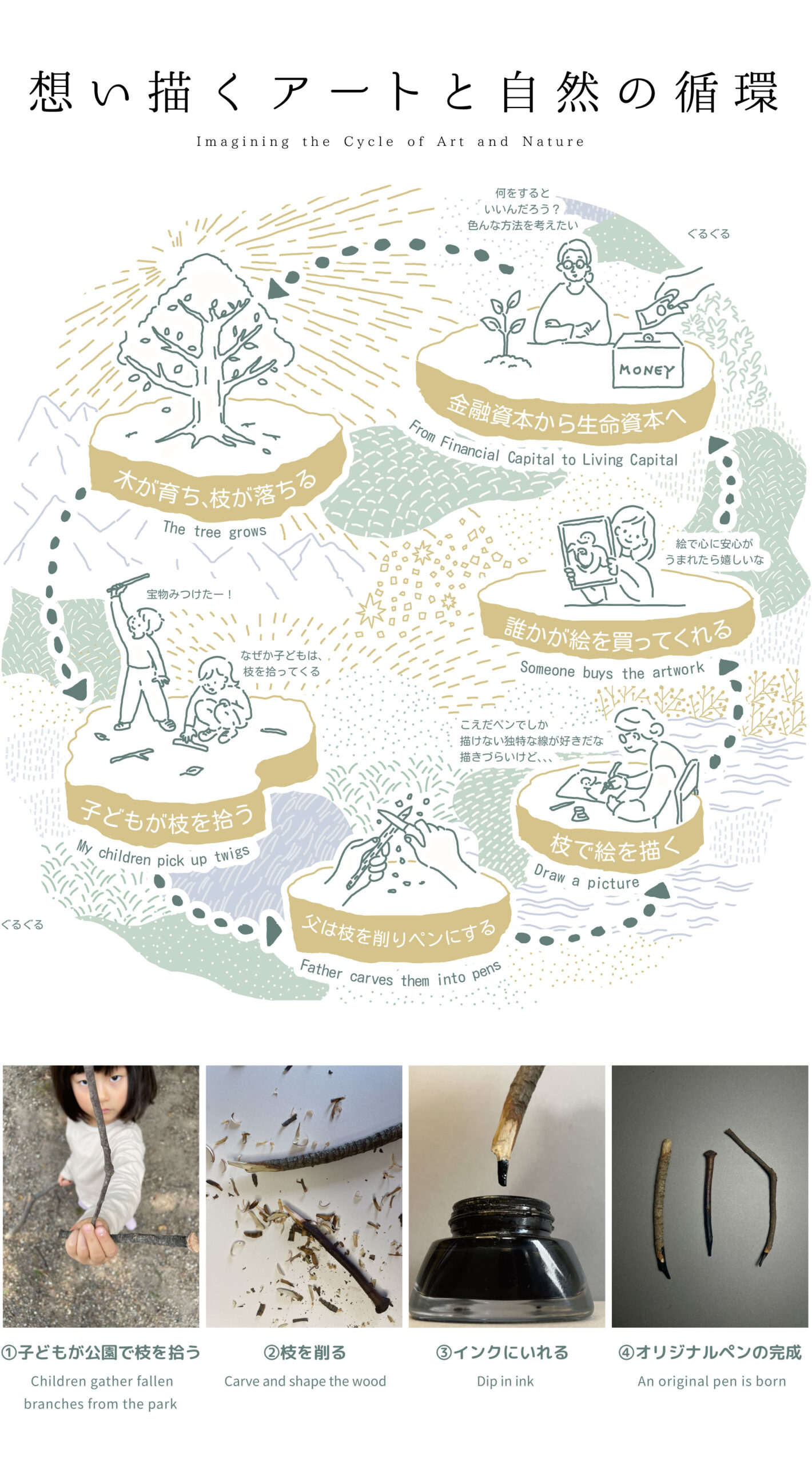 Trees grow, branches and leaves fall. Children collect the fallen twigs as treasures. I carve them into pens, draw with them, and the work reaches someone—all part of activities that return to nature.